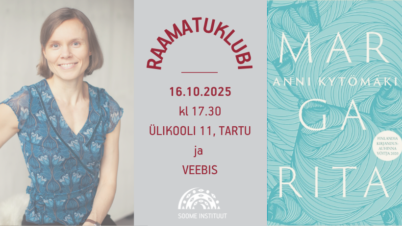 Oktoobrikuu raamatuklubis arutame Finlandia laureaadi Anni Kytömäki romaani „Margarita“ (tlk Toomas Tallo, 584 lk, Vesta Raamatud, 2021). Loe raamat läbi ja osale vestluses Soome Instituudi raamatukogus või veebis: https://shorturl.at/MCe2k