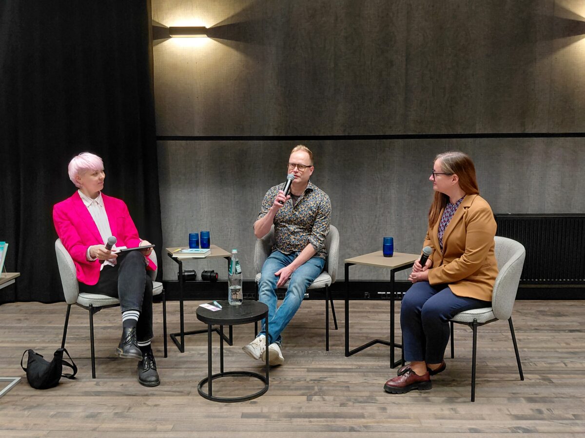 Euroopa autorite päeval esines Rahvusraamatukogus soome kirjanik Jukka Behm, kellle esitas vaimukaid küsimusi raamatusõber ja kirjastaja Elisa-Johanna Liiv ning nauditava sujuvusega tõlkis Behmi teoste tõlkija Helena Lemendik. Foto Peep Ehasalu